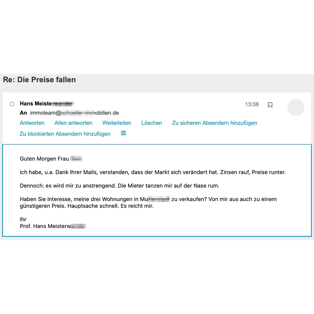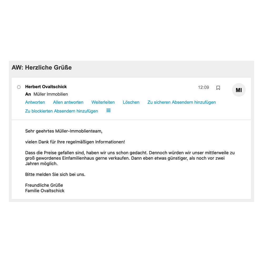 Mit unserer Hilfe wird Ihre Maklersoftware zur Akquisemaschine. Durch regelmäßige, automatisierte und sympathische E-Mailings an Ihre bestehende Kundendatenbank werden Verkaufsaufträge mit realistischen Preisvorstellungen der Eigentümer generiert.